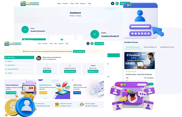 Buyers get their own student dashboard to track purchases and access their learning content. This is what separates Digital Academy Fortune from a simple digital store — it genuinely functions like an academy, with a member experience that builds retention and trust.